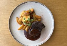 370 г • Картофельные драники с бифштексом из говяжьей щеки, грибным соусом и маринованным луком