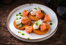 285 г • Картофельные драники с слабосолёным лососем, икорным кремом и корнем свежего хрена