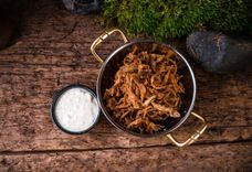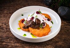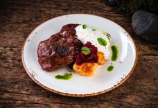 340 г • Картофельные драники с тушёной олениной, соусом Демиглас, сметаной и копченой вишней