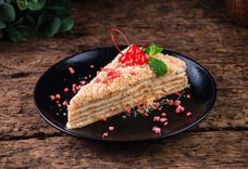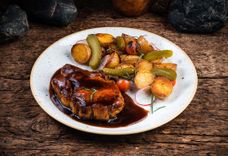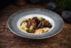 200 г • Хлеб деревенский, сливочный крем, говяжьи щеки, соус Демиглас, копченая вишня, руккола, жареный лук