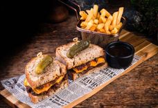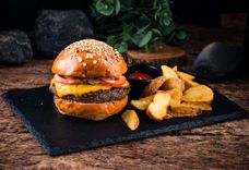 350/90 г • Сэндвич с говядиной, сыром Чеддер, карамелизированным луком, горчичным соусом и маринованным огурцом. Подаётся с картофелем фри и соусом Барбекю
