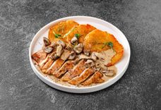 350 г • Картофельные драники с кусочками курицы, обжаренными в сливочном масле с добавлением тимьяна и розмарина. Подаются с грибами шиитаке и грибным соусом