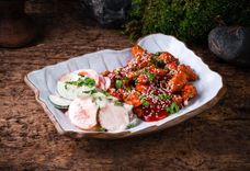 240 г • Закуска из тунца с персиком и огурцом. Заправляется фирменным соусом на основе кокосового молока, Унаги, сока лимона, сладкого чили соуса, устричного соуса и кунжутного масла