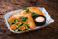 165 г • Хлеб деревенский, сливочный крем, куриные крылья, глазурь кимчи, грудинка, чипсы из вешенок, трюфельное масло