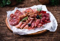 250/40 г • Отборные кусочки превосходного мяса свинины, сыровяленая колбаса, нежное соленое сало, копчёные колбаски, маринованый огурец и чеснок