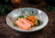 175 г • Хлеб деревенский, сливочный крем, соус песто, слабосоленый лосось, печеная тыква, руккола, сублимированная малина
