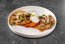 350 г • Картофельные драники подаются с обжаренными грибами шиитаке, вешенками и с грибным соусом