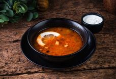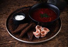 300/30 г • Традиционный насыщенный суп с говядиной, свининой и копченостями. Подаётся со сметаной