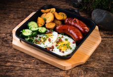 410 г • Свиные колбаски блэквурст подаются с печеным картофелем, куриным яйцом, грудинкой и малосольными огурцами