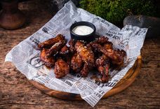 800/150/50 г • Традиционная горячая закуска из обжаренных во фритюре куриных крылышек с соусом на выбор и свежими хрустящими овощами