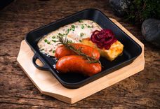 400 г • Куриные колбаски, подаются с картофельными драниками, грибным соусом, маринованной капустой и чипсами из вешенок