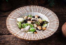 280 г • Интерпретация одного из самых популярных в мире салатов: листья салата, перепелиное яйцо, кусочки поджаренного куриного филе, гренки. Заправляется фирменным соусом Цезарь и сыром Пармезан