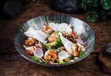 280 г • Обжаренные тигровые креветки в темпуре. Подаются с миксом салата, редисом, томатами черри, устричным соусом и соусом из васаби и цитруса