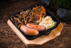 1260 г • Метр домашней колбасы, подается с тушеной капустой, картофелем фри, картофельными дольками, малосольным огурцом, кукурузой и тремя видами соуса: тартар, горчица и хрен