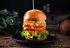 400/100/30 г • Сочный кусок курицы в хрустящем кляре. Подаётся в булочке бриошь с мягким сыром Моцарелла, слайсами свежих томатов и огурцов, салатом айсберг и соусом Цезарь, картофельными дольками и соусом Тартар