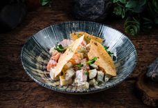 300 г • Микс из отварного картофеля, перепелиных яиц, томатов, сыра Маасдам, маринованных огурчиков и ветчины. Заправляется сметаной с домашним майонезом и горчицей. Подается с сухариками из белого хлеба
