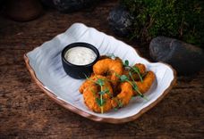 190/50 г • Креветки в хрустящей панировке, приготовленные в соевом соусе. Подаются с соусом на выбор