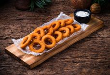 150/50 г • Кольца лука, обжаренные в хрустящей панировке. Подаются с соусом на выбор